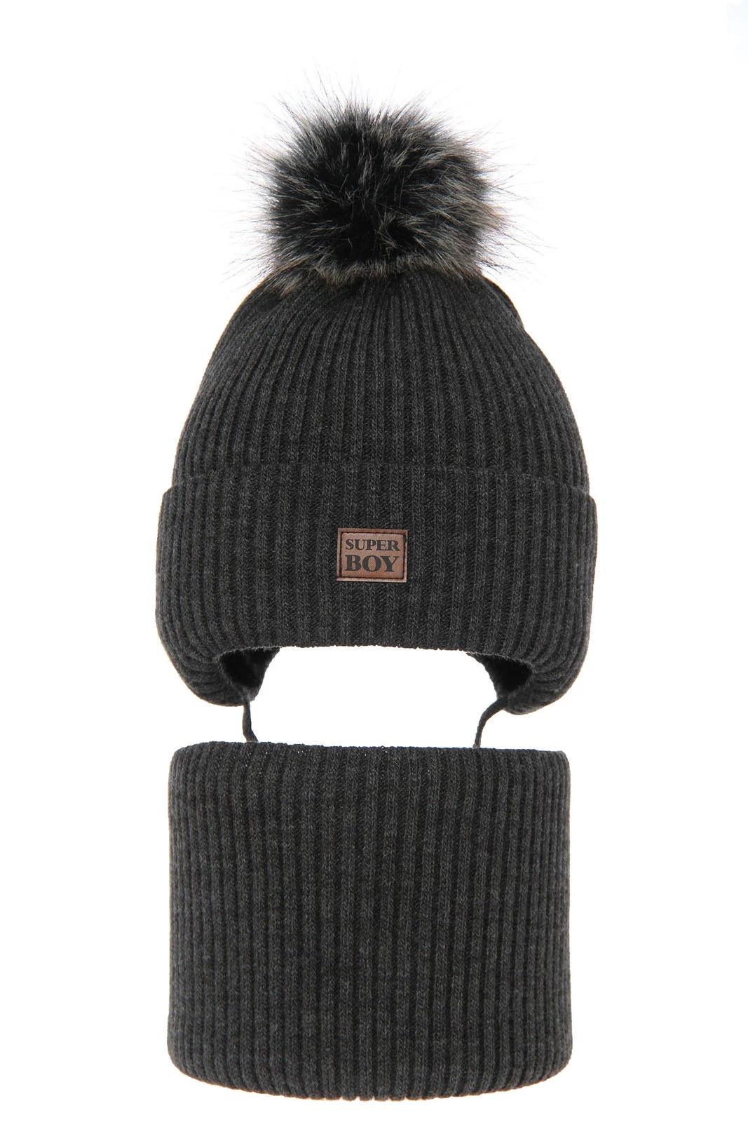 Winterset Jungen: Mütze und Schlauchschal mit Bommel Grau Denzel