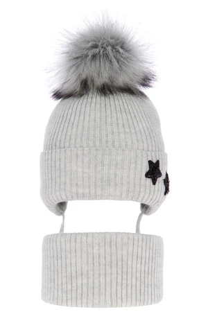 Winterset Mädchen: Mütze und Schlauchschal mit Bommel Grau Delicja