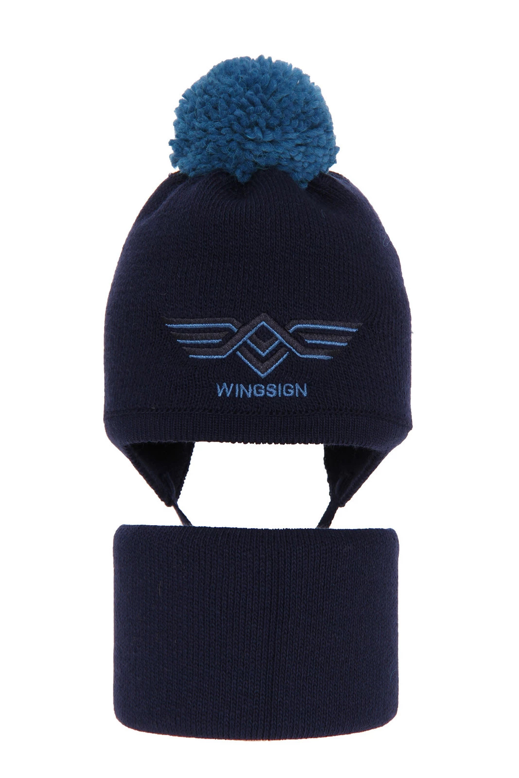 Winterset Jungen: Mütze und Schlauchschal mit Bommel Navy Blau Wings