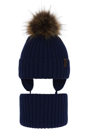 Winterset Jungen: Mütze und Schlauchschal mit Bommel Navy Blau Puzel