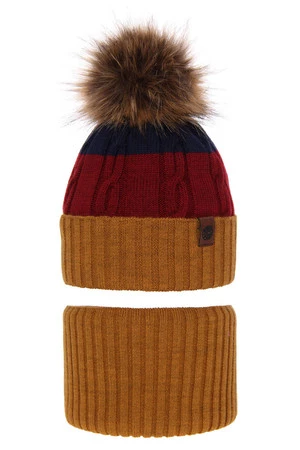 Winterset Jungen: Mütze und Schlauchschal mit Bommel Senffarben Karmel