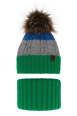 Winterset Jungen: Mütze und Schlauchschal mit Bommel Grün Karmel