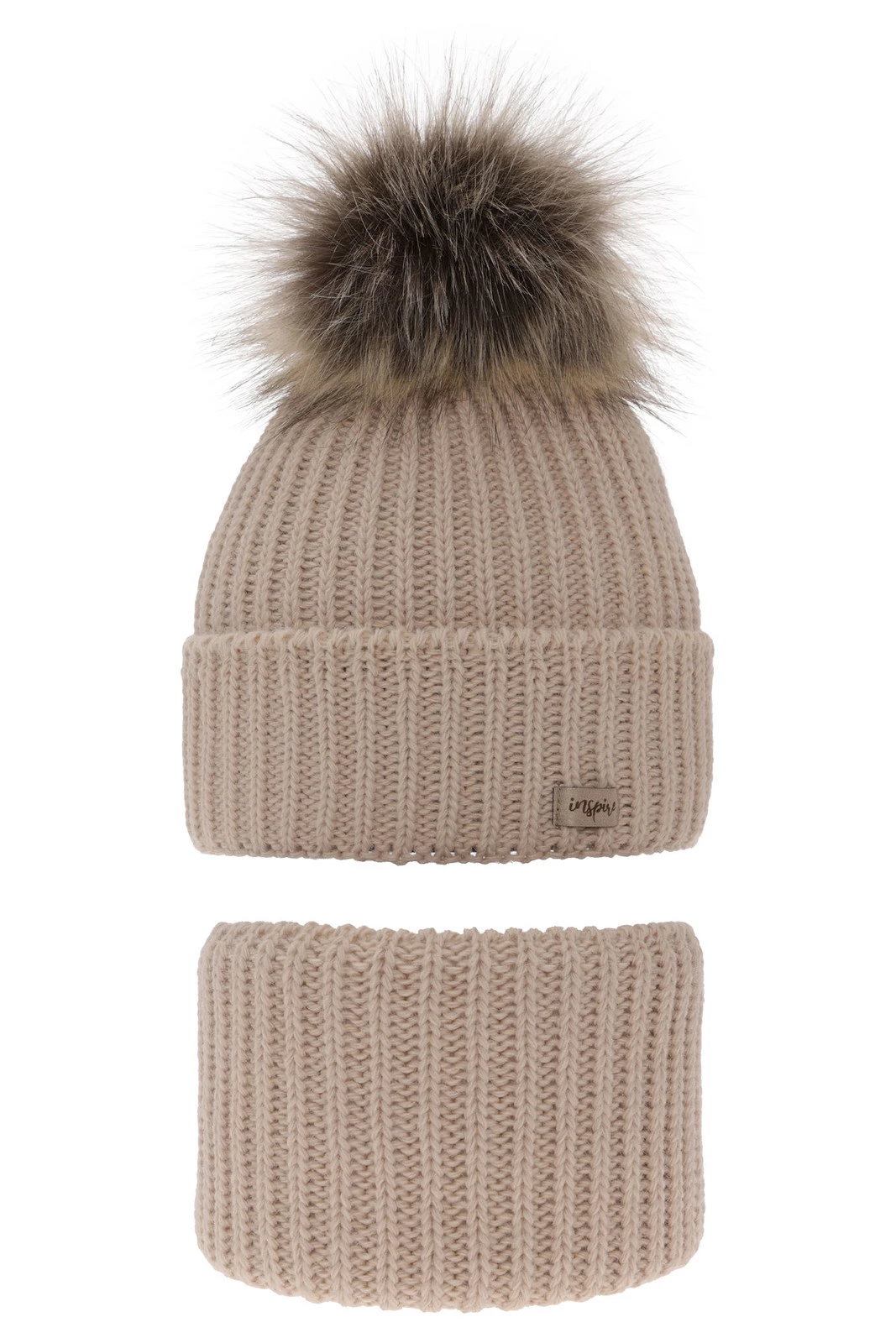 Winterset Mädchen: Mütze und Schlauchschal mit Bommel Beige Willow