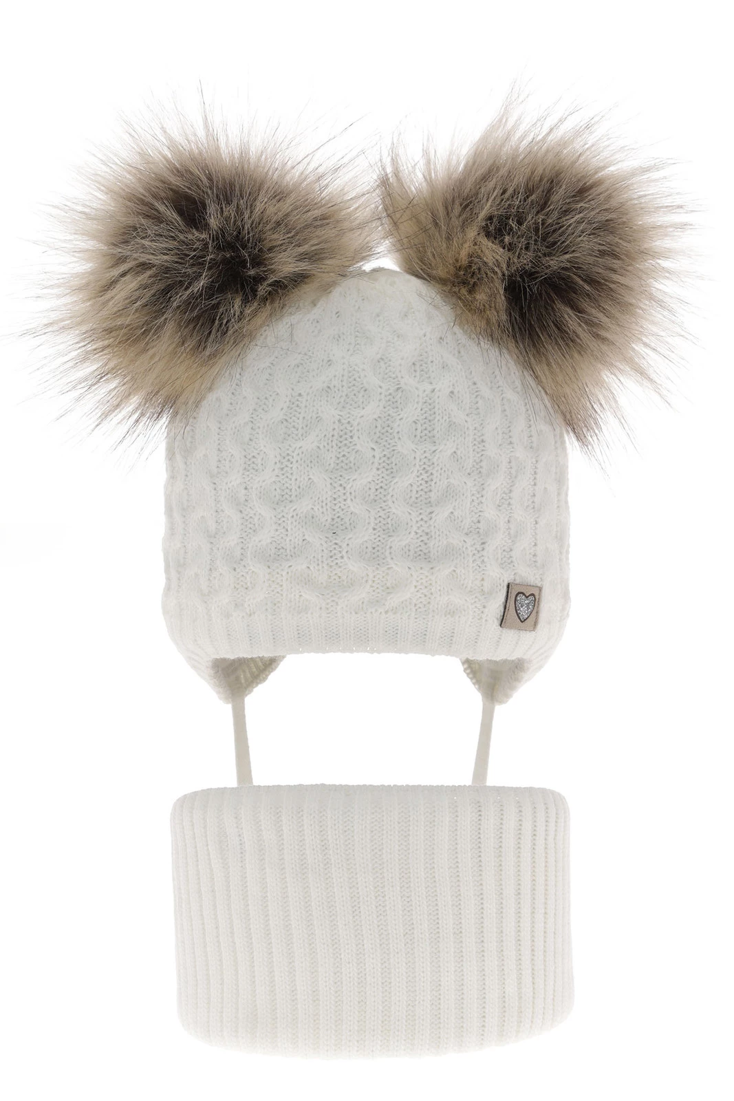 Winterset für Mädchen: Mütze und Schlauchschal mit zwei Bommeln in Weiß Poliana