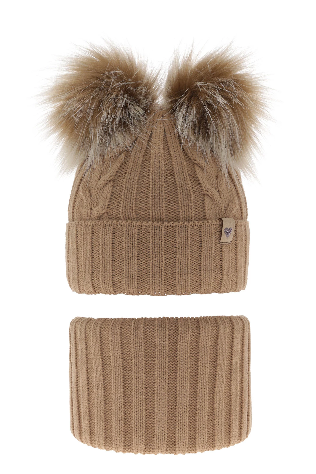 Winterset für Mädchen: Mütze und Schlauchschal mit zwei Bommeln in Camel Amala