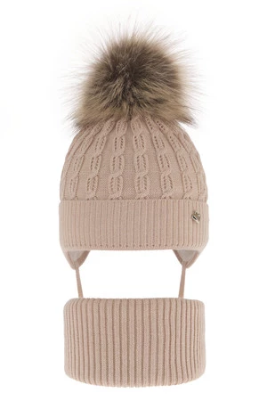 Winterset für Mädchen: Mütze und Schlauchschal mit Bommel in Beige Tukana