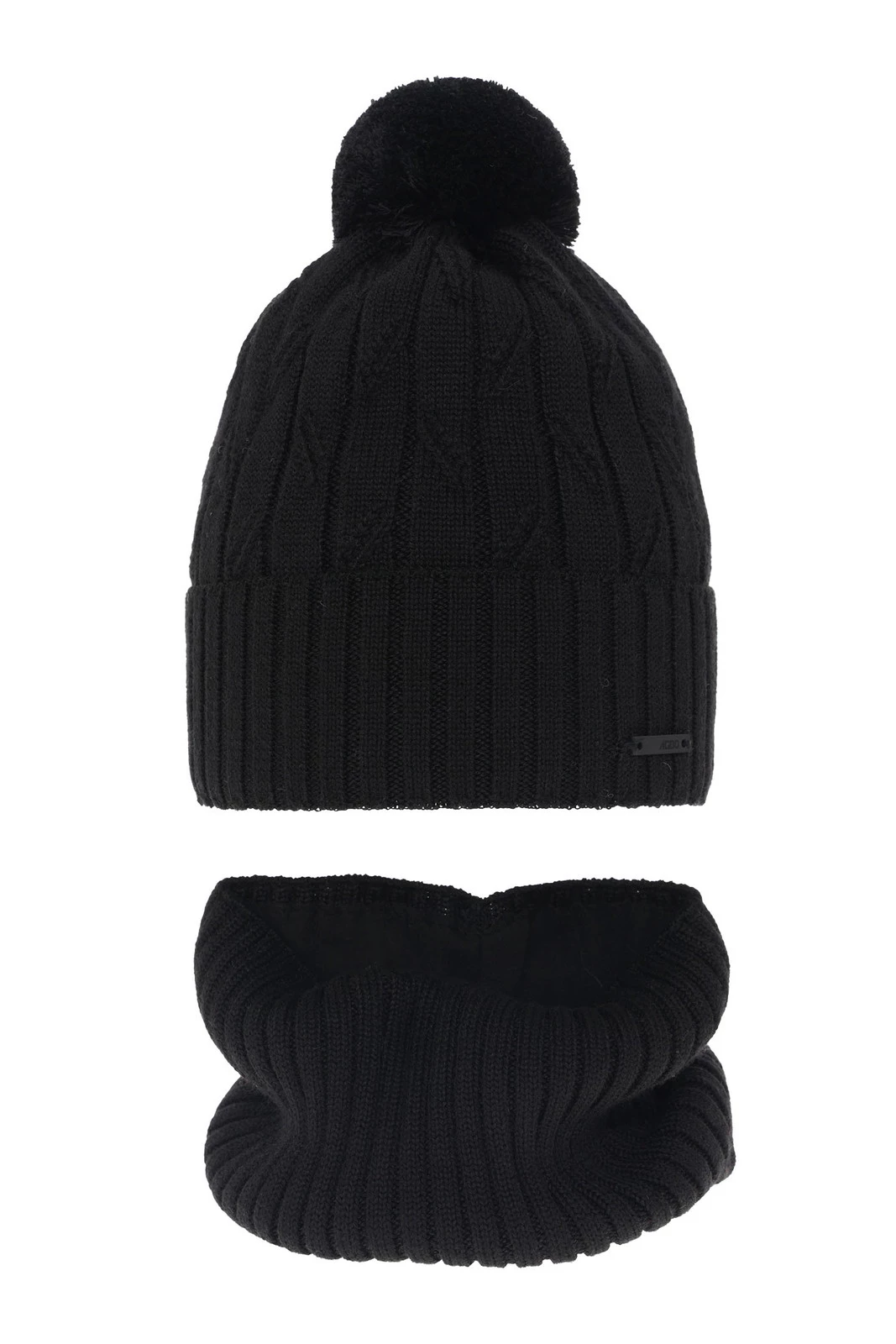 Winterset für Jungen: Mütze und Schlauchschal mit Bommel aus Merinowolle in Schwarz Talar