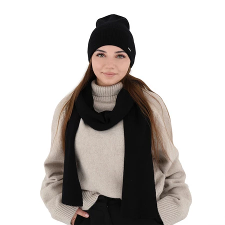 Damen-Set Frühling - Winter: Mütze und Schal Schwarz 100% extrafeine Merinowolle Melpomena