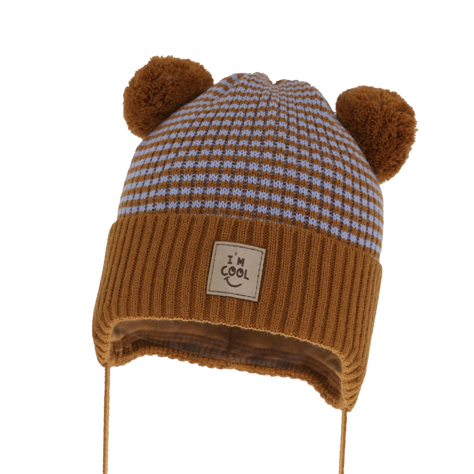 Die charakteristischen Elemente unserer Mütze sind die zwei niedlichen Garnbommeln, die ihr einen unverwechselbaren Charakter verleihen. Dank ihnen wird sich Ihr Sohn auf dem Spielplatz und im Kindergarten von der Masse abheben. Das modische Streifenmuster und der süße Aufnäher mit der Aufschrift "I'm cool" machen diese Herbst- und Frühlingsmütze für Jungen zu einem modischen Akzent jedes Outfits.