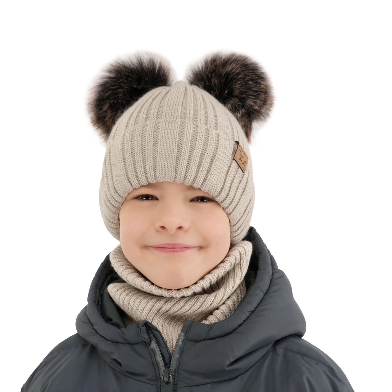 Die Wintermütze für Jungen zeichnet sich durch die charakteristischen zwei Bommeln aus Öko-Fell aus, die ihr einen einzigartigen und modischen Charakter verleihen. Sie ist auch mit einem stilvollen Abzeichen auf dem Umschlag verziert, das einen interessanten Design-Akzent darstellt. Am wichtigsten ist, dass das Ganze in einer speziellen Strickart gefertigt wurde, die nicht nur großartig aussieht, sondern auch eine ausgezeichnete Wärmeisolierung bietet.