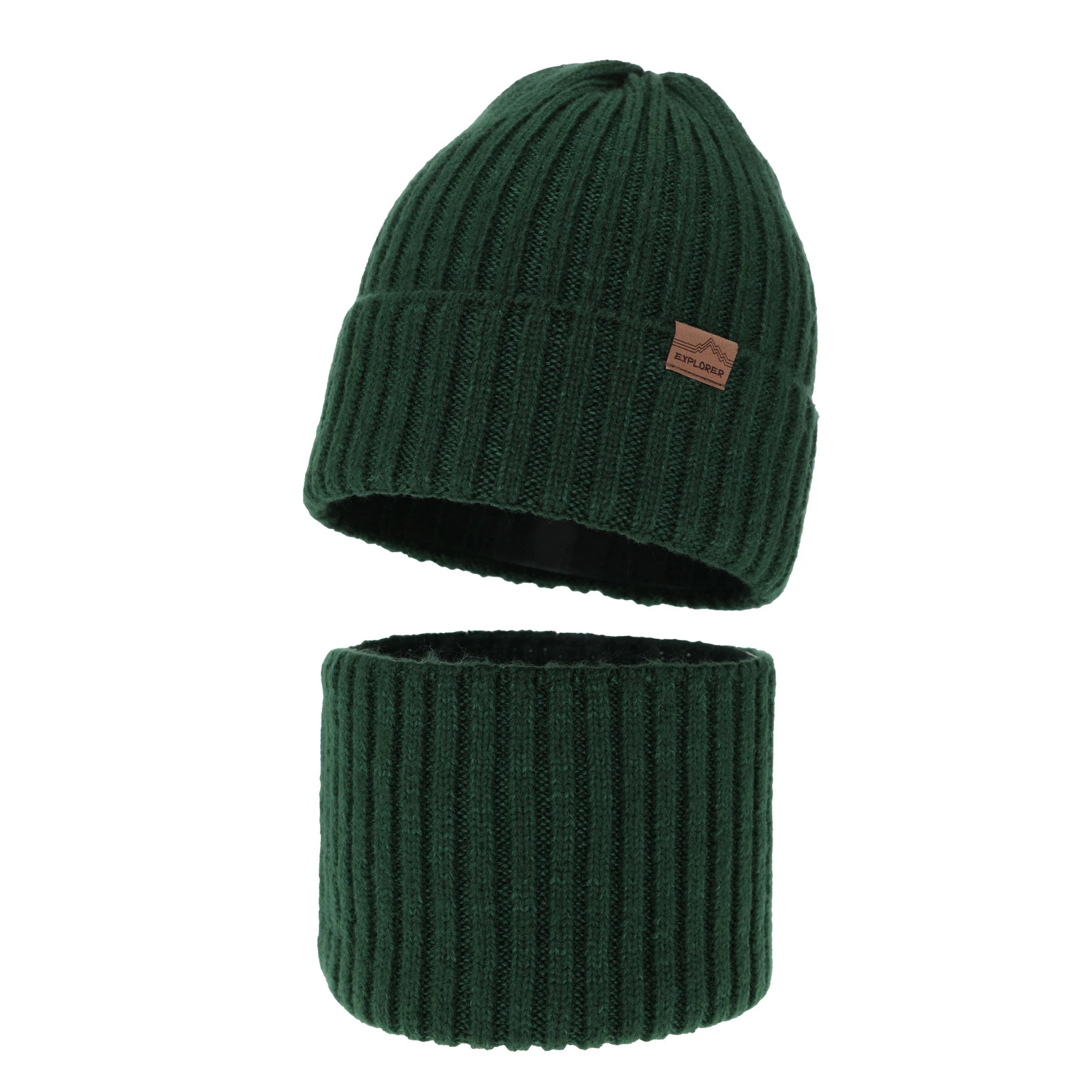 Winterset für Jungen: Mütze und Schlauchschal Merinowolle in Grün Merinowolle Karmin