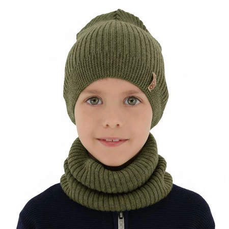 Herbst und Frühlingsset Jungen: Mütze und Schlauchschal 100% extrafeine Merinowolle Khaki Chester