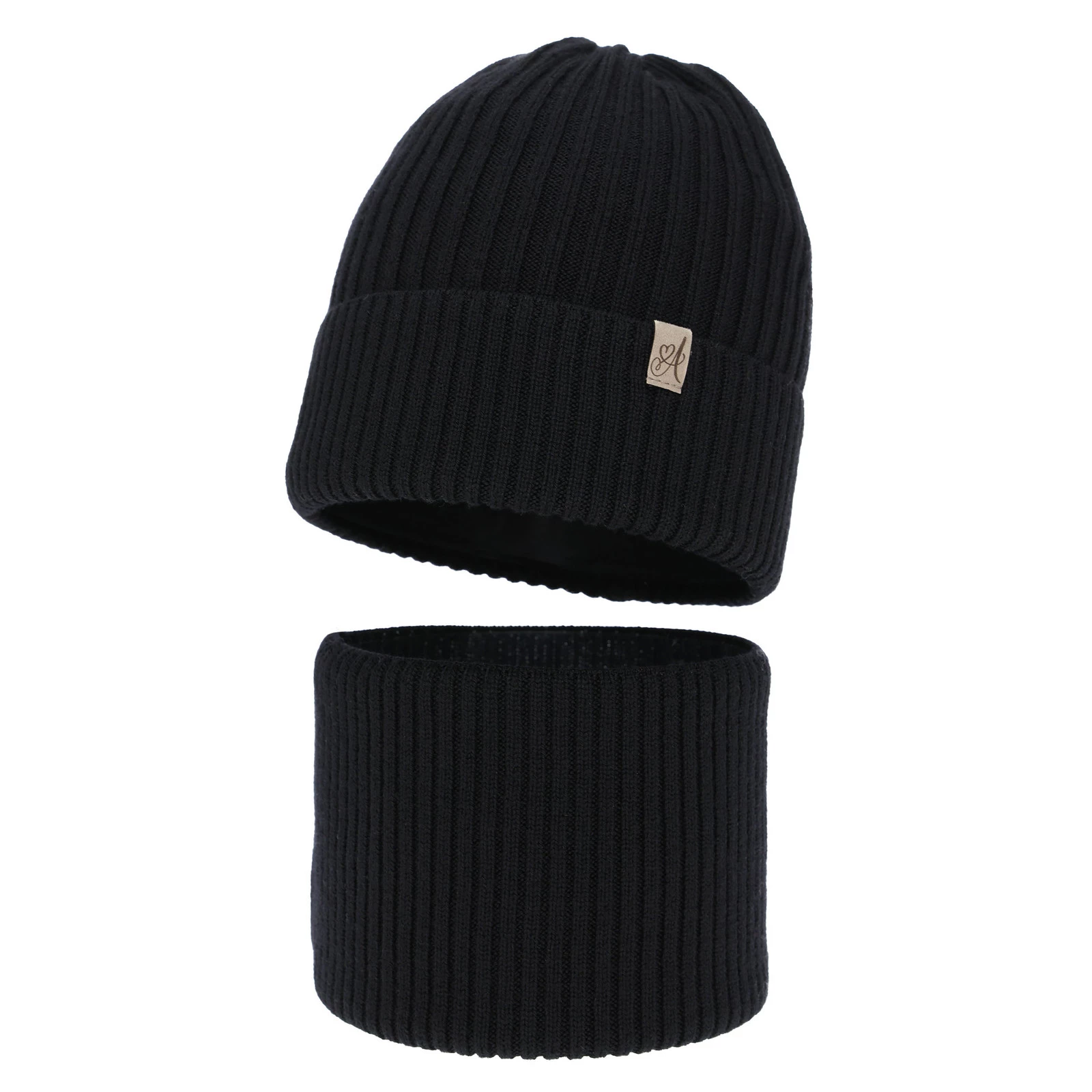 Winterset Mädchen: Mütze und Schlauchschal aus 100% Merinowolle, Schwarz, Patricia