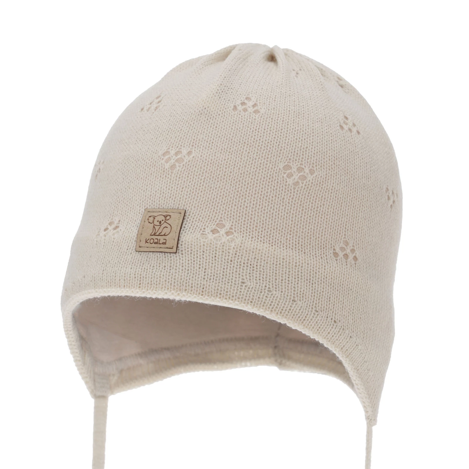 Die praktischen Bindebänder ermöglichen eine individuelle Anpassung und garantieren, dass die Herbst und Frühlingsmütze auch bei aktivem Spiel sicher sitzt. Der charmante Aufnäher verleiht der Mütze eine besondere Note und macht sie zu einem echten Hingucker. Die interessante gehäkelte Strukturoptik unterstreicht den modernen Charakter dieses Accessoires.