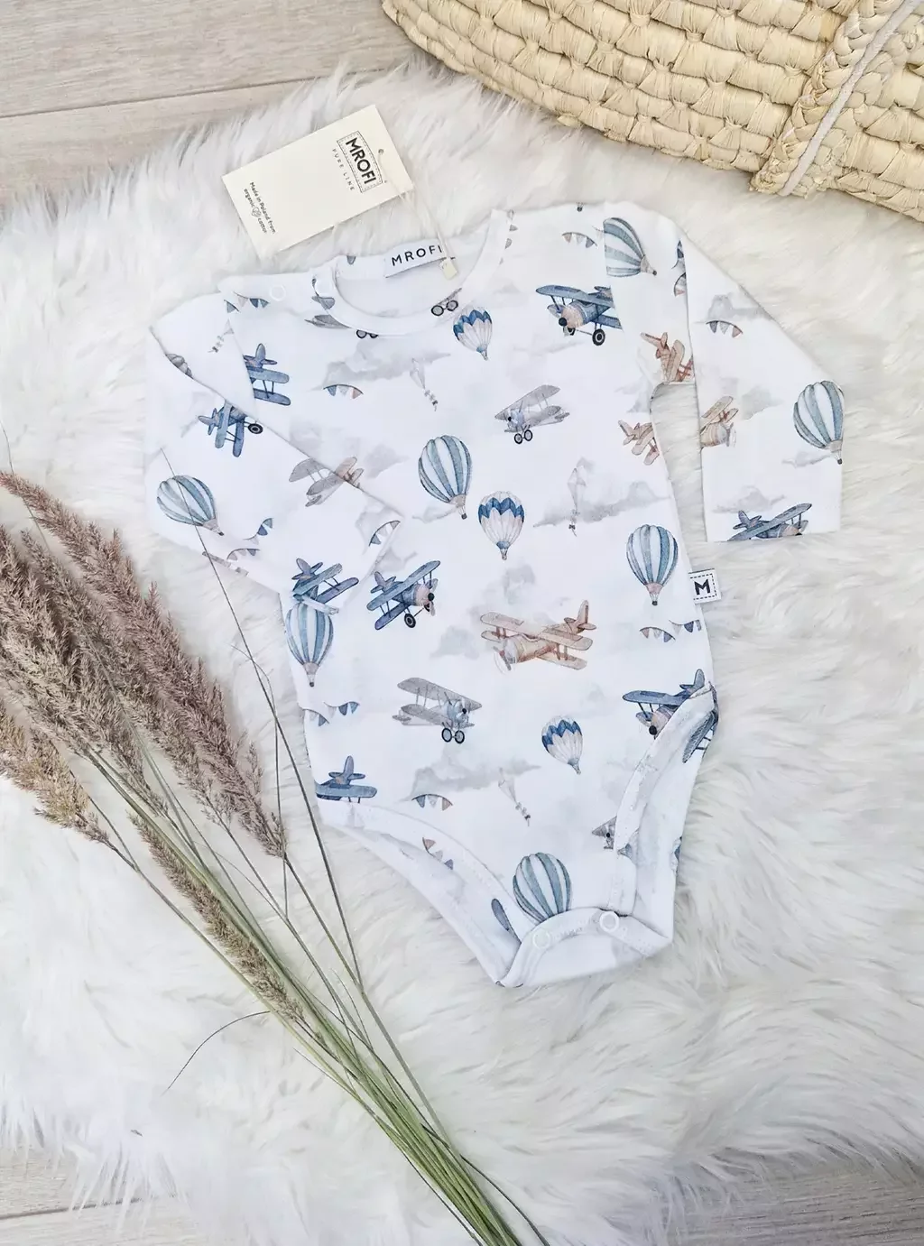 Baby-Body aus zertifizierter Bio-Baumwolle, sicher für Haut, die zu Reizungen und Allergien neigt. Es ist perfekt, wenn Sie die Babypflege einfacher machen möchten. Wählen Sie einen Baby-Body mit langen Ärmeln und nickelfreien Druckknöpfen, der jungen Eltern das Pflegen und Ausziehen des Babys erleichtert, wenn es die Windel verschmutzt. Bei der Kleidung aus der Mrofi Vintage Planes-Kollektion handelt es sich um Kleidung, die vollständig in Polen genäht wird.
