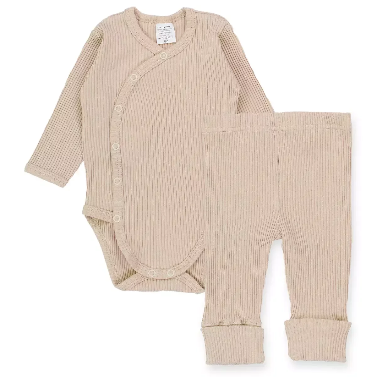 Baby-Set – gerippter Umschlag-Body + Hose – Beige